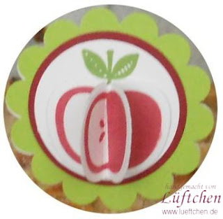 Hier sieht man die Rückseite vom Geburtstagsspieß mit Apfel. Ich liebe dieses Stempelset aus dem Herbst-Weihnachtskatalog. Den Apfel haben wir dreimal gestempelt und ausgestanzt. Er sieht sehr schön in 3D aus.