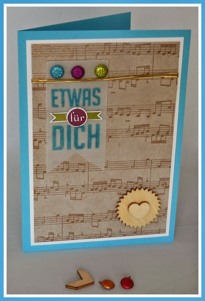 Ich habe das Papier Meisterwerke mit dem Fingerschwämmchen und Craftweißer Stempelfarbe erst noch aufgehellt. Das Fähnchen habe ich auf Pergamentpapier gestempelt und dann noch mit zwei weiteren Farben auf Flüsterweiß gestempelt, passend zu den Glitzerklammern. Dann habe ich das Ganze zusammengesetzt.